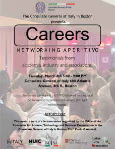 March 4, 2025, from 5:00 PM to 9:00 PM, the Consulate General of Italy in Boston is organizing Careers 2025, an exclusive networking event for Italian and Italian-American students and young professionals, as well as leading experts in the academic, entrepreneurial, and association sectors.